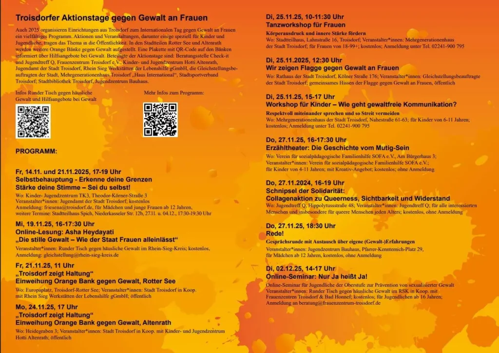 Grund genug für Institutionen aus Troisdorf auch in diesem Jahr mit einem vielfältigen Veranstaltungsprogramm für das Thema zu sensibilisieren. Dieses Jahr stehen besonders Kinder und Jugendliche im Fokus der Aktionstage. Mit dabei sind die folgenden Institutionen : Check it + JugendtreffQ , Jugendzentrum TK3, Jugendzentrum Bauhaus, Frauenzentrum Troisdorf, Stadtsportverband Troisdorf, Jugendzentrum Hotti, Jugendamt Troisdorf, RheinSiegWerkstätten der Lebenshilfe, SOFA e.V., Mehrgenerationenhaus, Stadtbibliothek Troisdorf und die Gleichstellungsbeauftragte der Stadt Troisdorf.